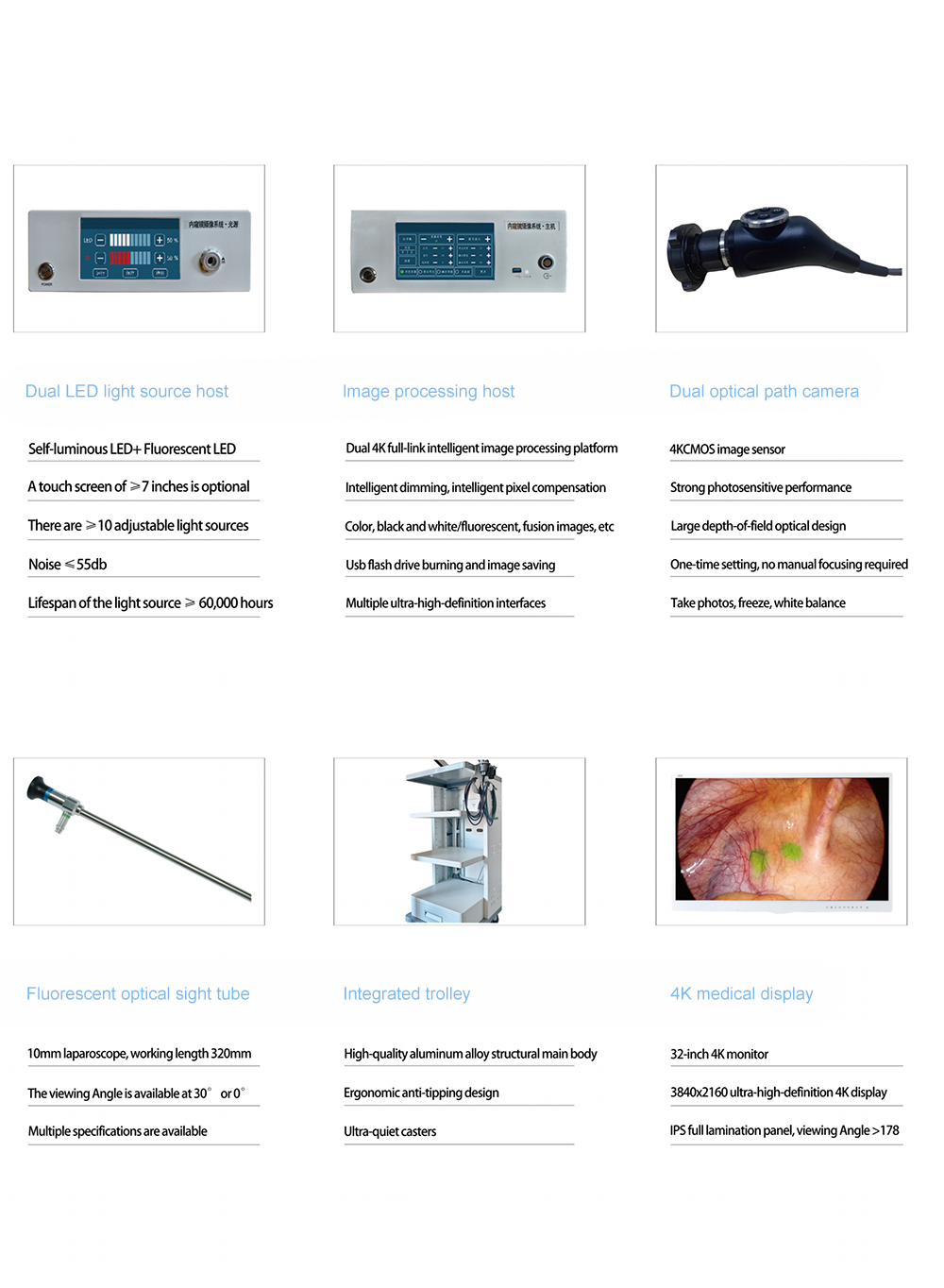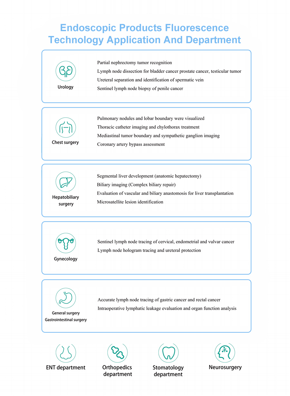 It can be equipped with various specifications of endoscopes and open surgical probes to meet the needs of minimally invasive fluorescence surgeries in urology, gynecology, hepatobiliary surgery, etc.