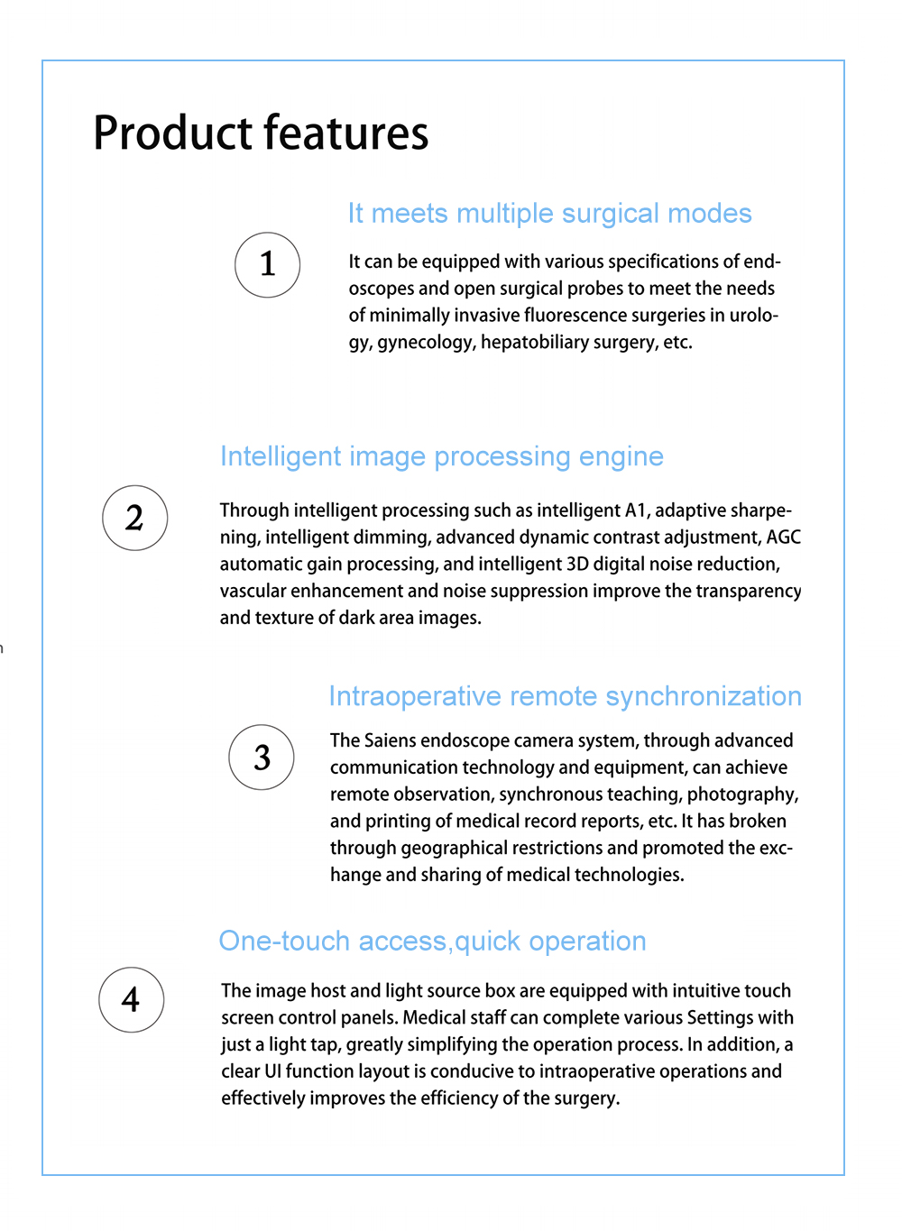 The Saiens endoscope camera system, through advanced communication technology and equipment, can achieve remote observation, synchronous teaching, photography, and printing of medical record reports, etc. It has broken through geographical restrictions and promoted the exchange and sharing of medical technologies.