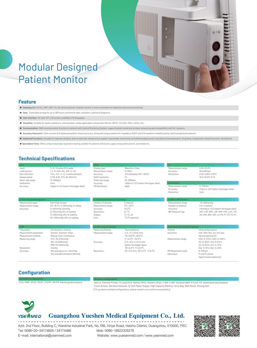 Dos conectores: EtCO2, 2 lBP, 4 lBP, CO, AG pueden ser opcionales; el monitor modular es más conveniente para la detección y más económico;