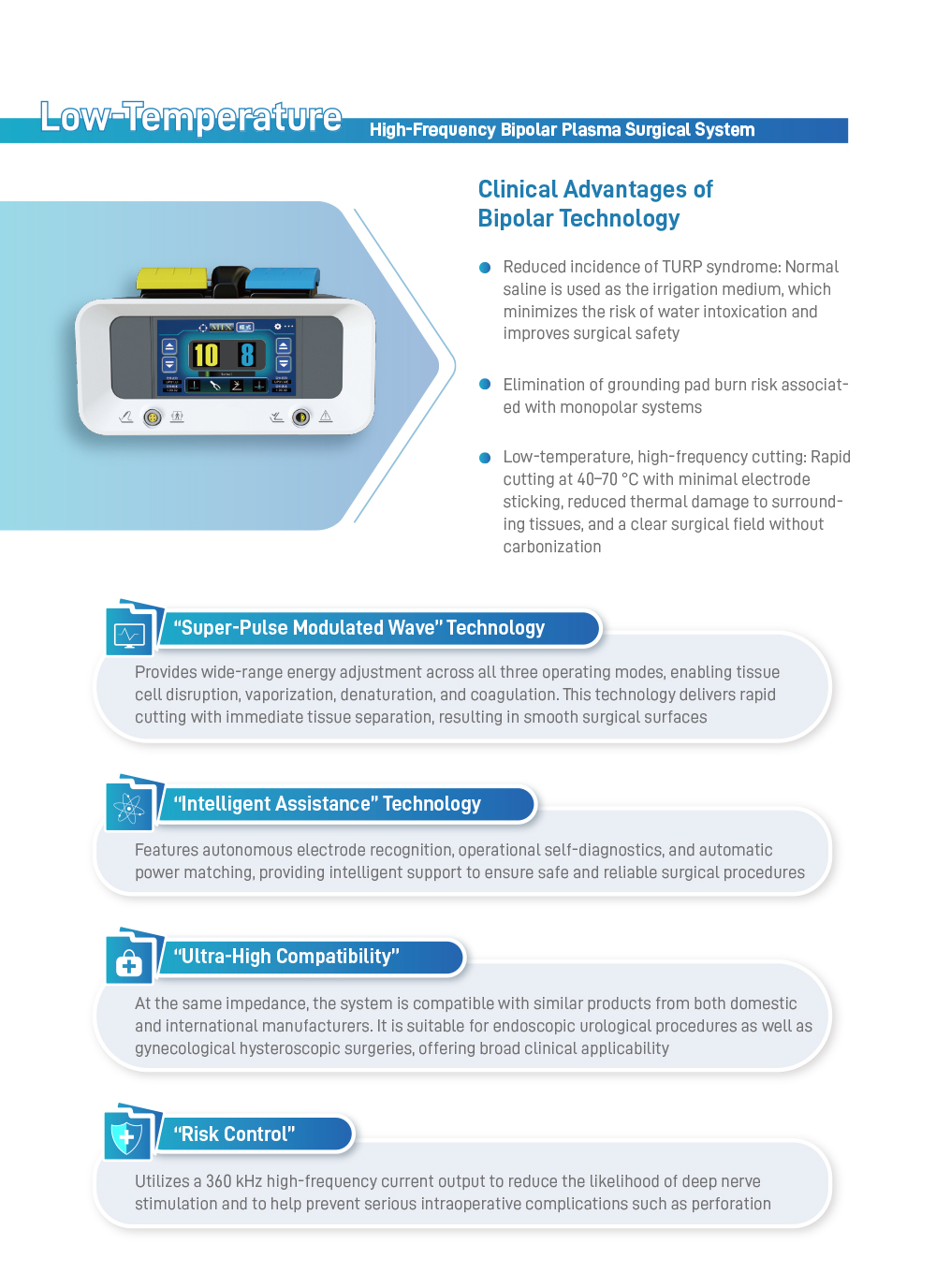 Sistema quirúrgico de plasma bipolar de alta frecuencia para urología y ginecología, que ofrece corte a baja temperatura y ablación precisa.
