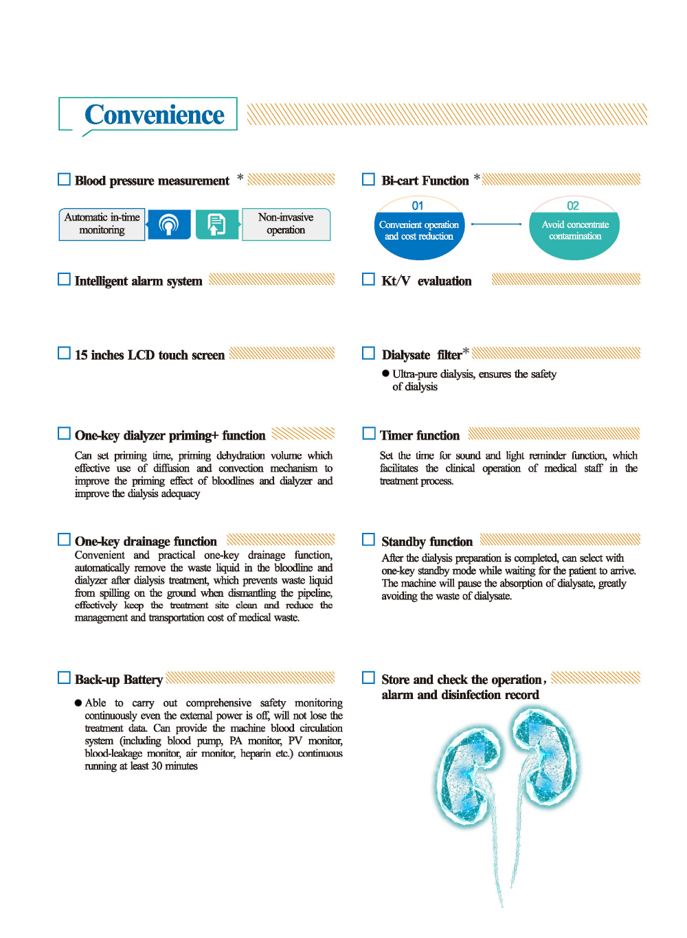 | Detección de fugas de sangre | Alarma fotocrómica cuando el eritrocitos son específicos El volumen es 0,32 ± 0,02 o el volumen de fuga de sangre es igual o mayor a 1 ml por litro de dializado. |