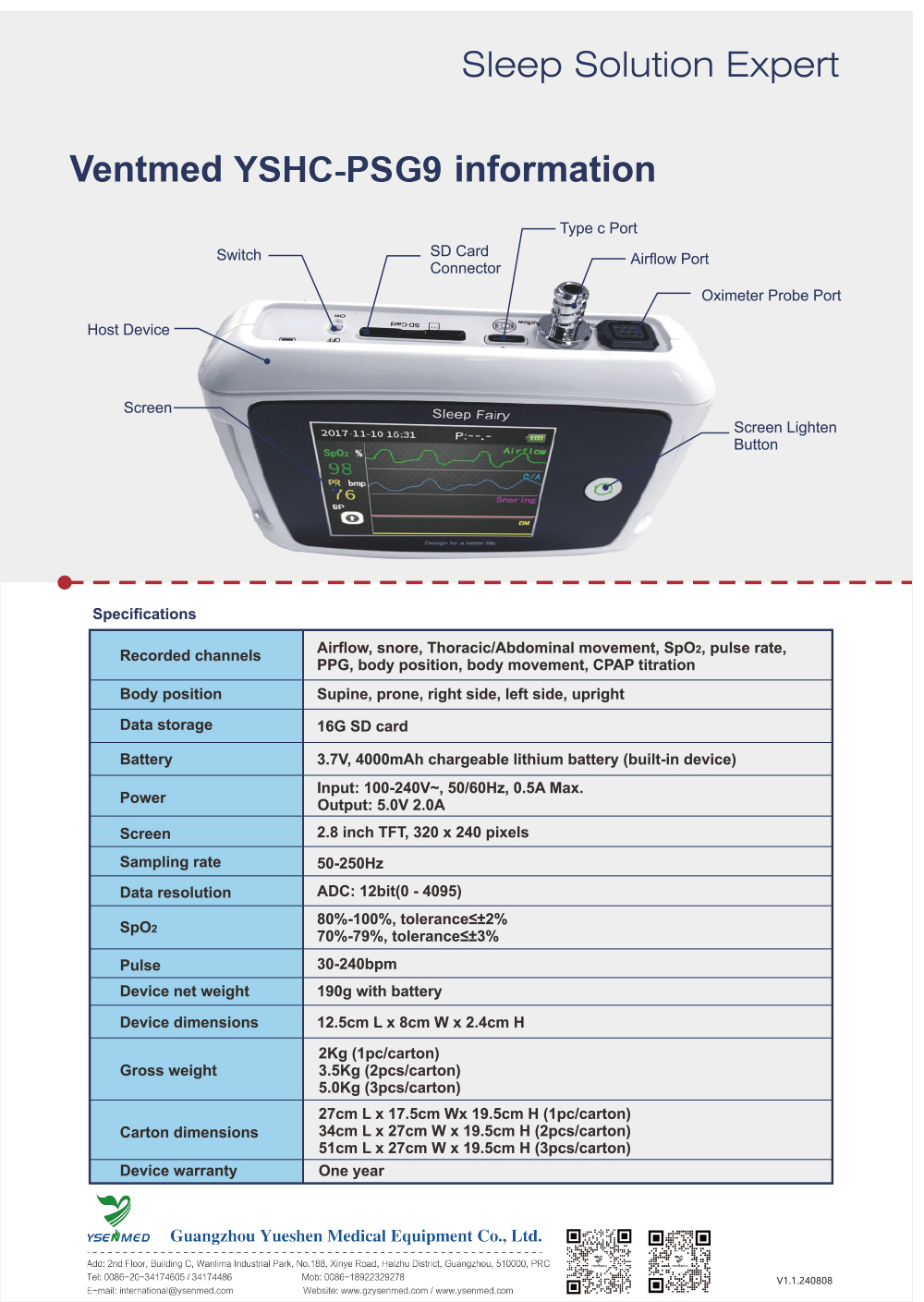Dispositif de surveillance du sommeil YSENEMD YSHC-PSG9