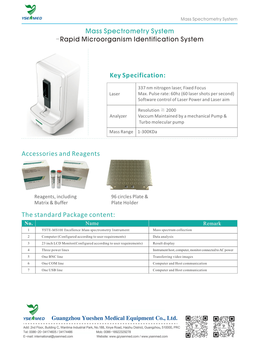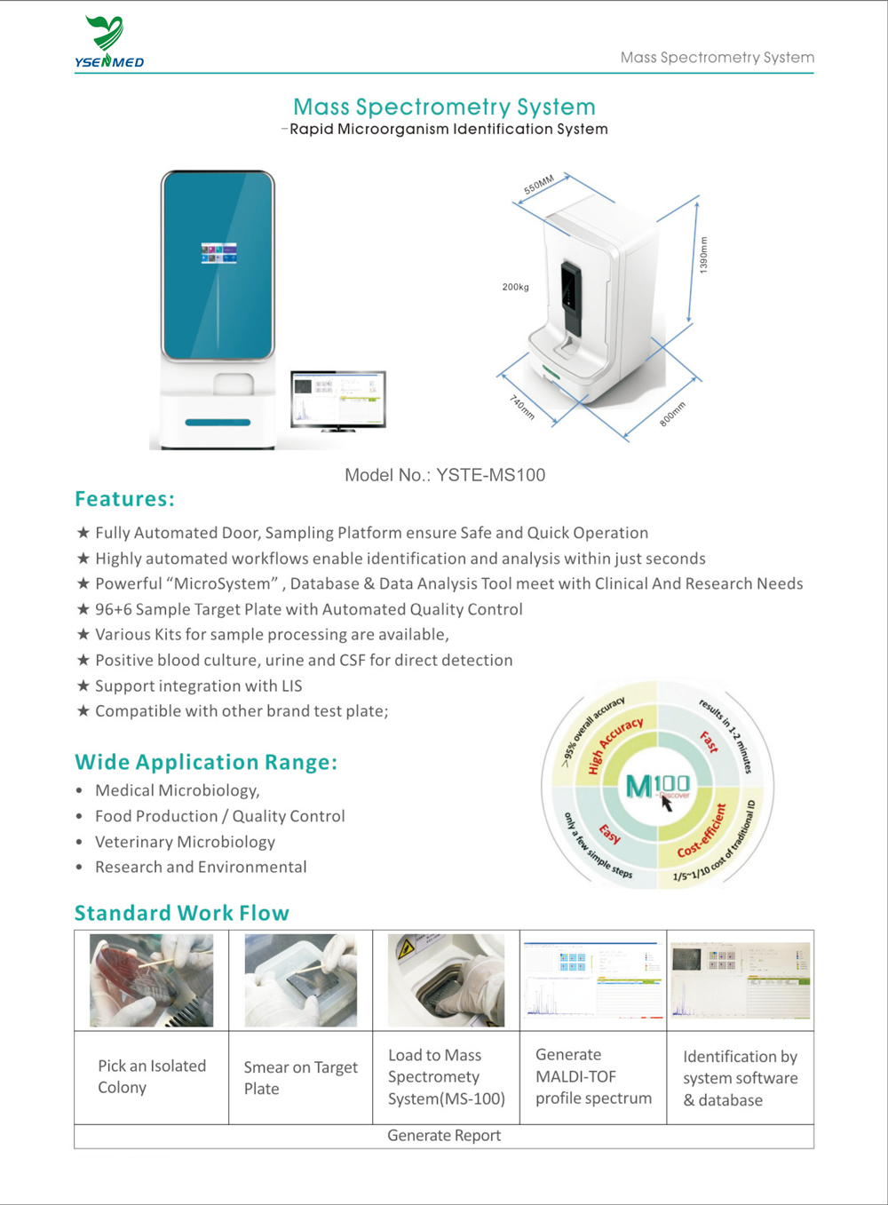 【Technical principle】 The YSTE-MS100 mass spectrometer detects the protein fingerprint (PMF) of microbial samples by Matrix-Assisted Laser Desorption/lonization Time of Flight Mass Specteometry (MALDI-TOF MS). , the software searches and matches these fingerprints with the standard fingerprints of various microorganisms in the system standard database to complete the rapid and accurate identification of the microorganisms to be tested.